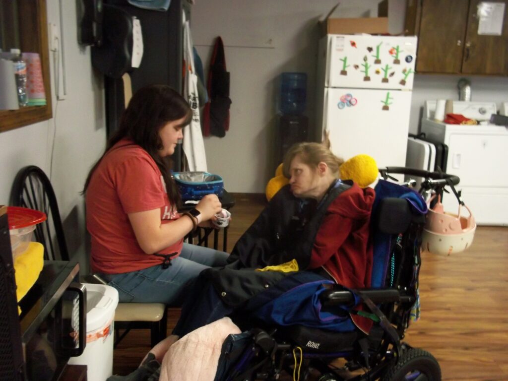 A staff person is assisting a person served with their lunch in ADP. Some people need total assistance in doing everyday tasks.